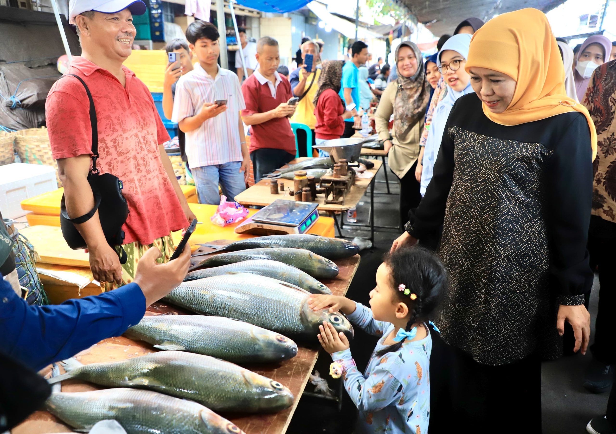 Gresik – Gubernur Jawa Timur Khofifah Indar Parawansa bersama cucu pertamanya, Aisyah Nabila atau yang akrab dipanggil Aila mengunjungi Pasar Bandeng Gresik, Kamis (27/3).