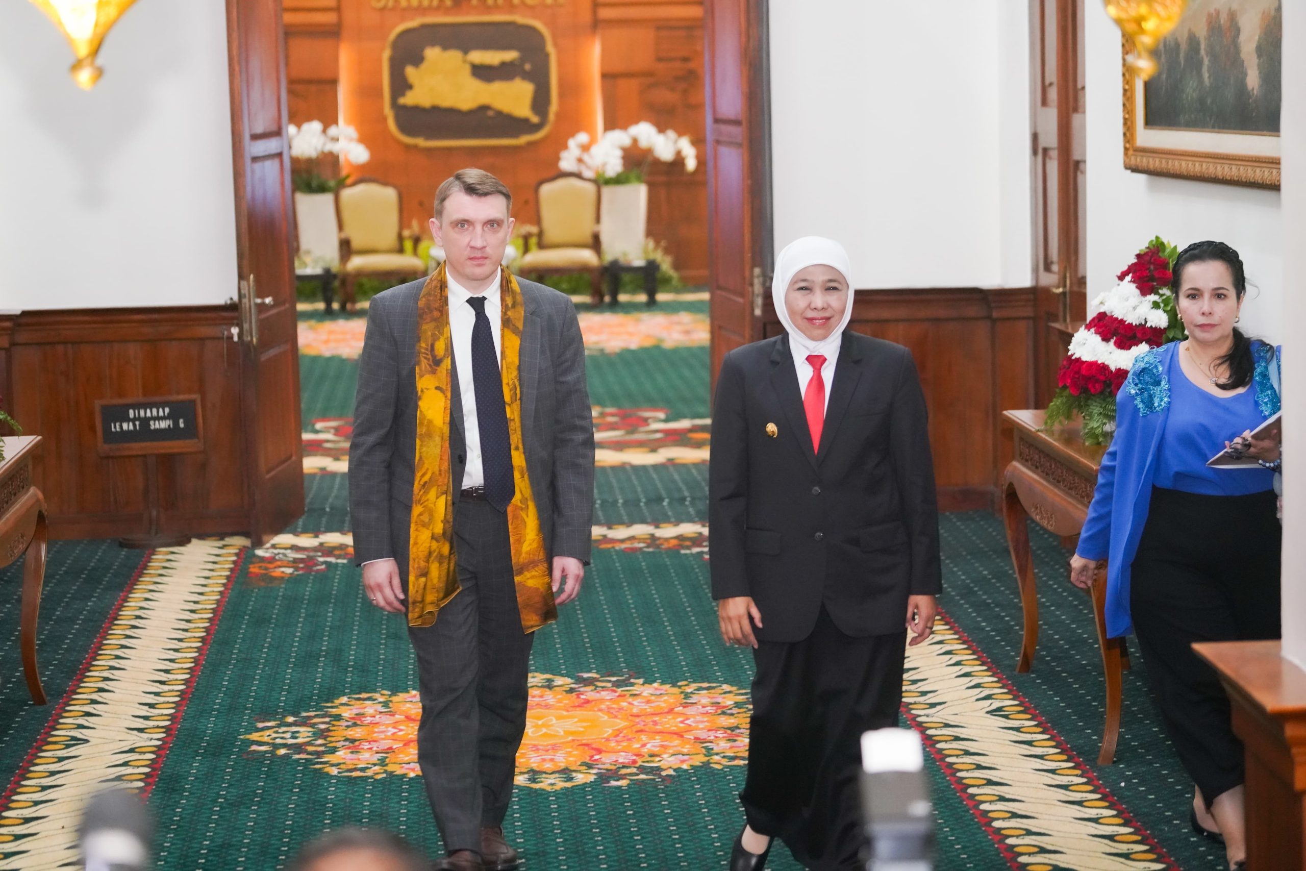 SURABAYA, 17 APRIL 2025 – Gubernur Jawa Timur Khofifah Indar Parawansa menerima kunjungan Delegasi Provinsi Tomsk, Rusia di Gedung Negara Grahadi Surabaya, Rabu (16/4) malam.