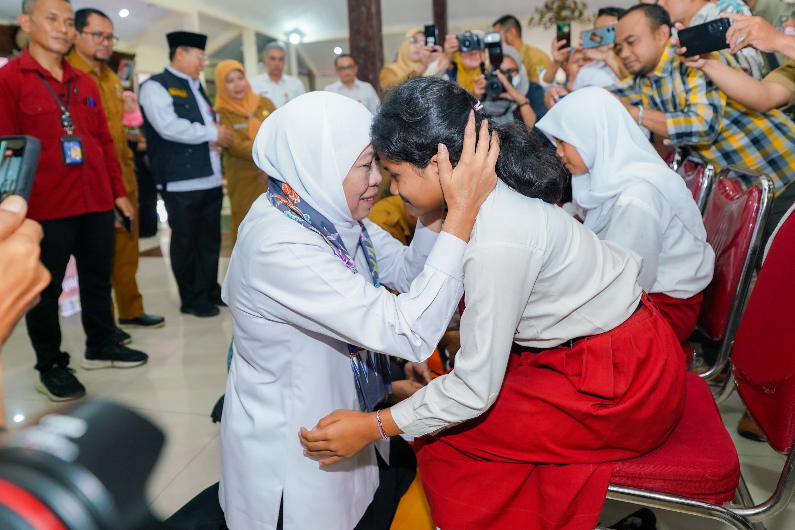 Pada kesempatan yang sama, Gubernur Khofifah juga memberikan sepatu sekolah kepada 10 anak-anak dari keluarga kurang mampu yang akan memasuki jenjang Sekolah Menengah Pertama (SMP). Bantuan ini merupakan simbol kepedulian terhadap masa depan pendidikan anak-anak di Jawa Timur.