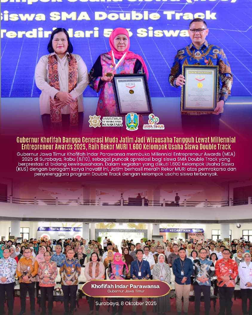 SURABAYA, 9 OKTOBER 2025 – Gubernur Jawa Timur Khofifah Indar Parawansa menyampaikan rasa bangga dan apresiasi atas capaian luar biasa para siswa SMA Program Double Track yang berhasil membentuk 1.600 Kelompok Usaha Siswa (KUS) dan memecahkan Rekor Museum Rekor Dunia Indonesia (MURI).