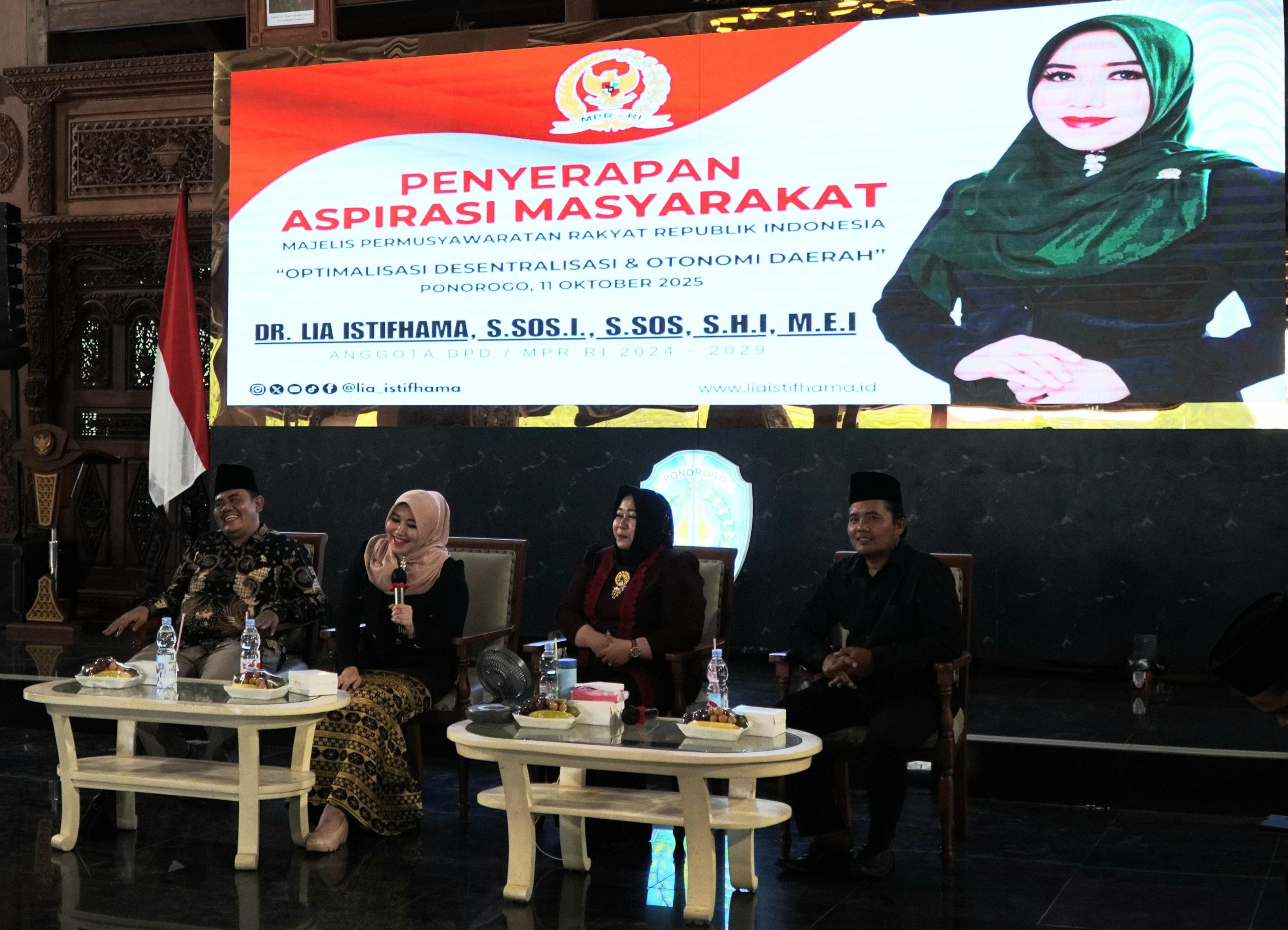 Ponorogo, 11 Oktober 2025 — Anggota DPD RI sekaligus MPR RI, Dr. Lia Istifhama, S.Sos.I., S.Sos., S.H.I., M.E.I., menggelar kegiatan Penyerapan Aspirasi Masyarakat di Kabupaten Ponorogo dengan tema “Optimalisasi Desentralisasi dan Otonomi Daerah”. Kegiatan ini menjadi wadah penting bagi masyarakat untuk menyampaikan berbagai aspirasi dan permasalahan daerah secara langsung kepada wakilnya di parlemen.