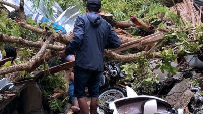 Angin kencang membuat sebuah pohon tumbang menimpa warung kopi di kawasan wisata petirtaan Jolotundo, Mojokerto, tkejadian ini mengakibatkan 2 orang di dalam warung tewas, sedangkan 7 lainnya luka berat.